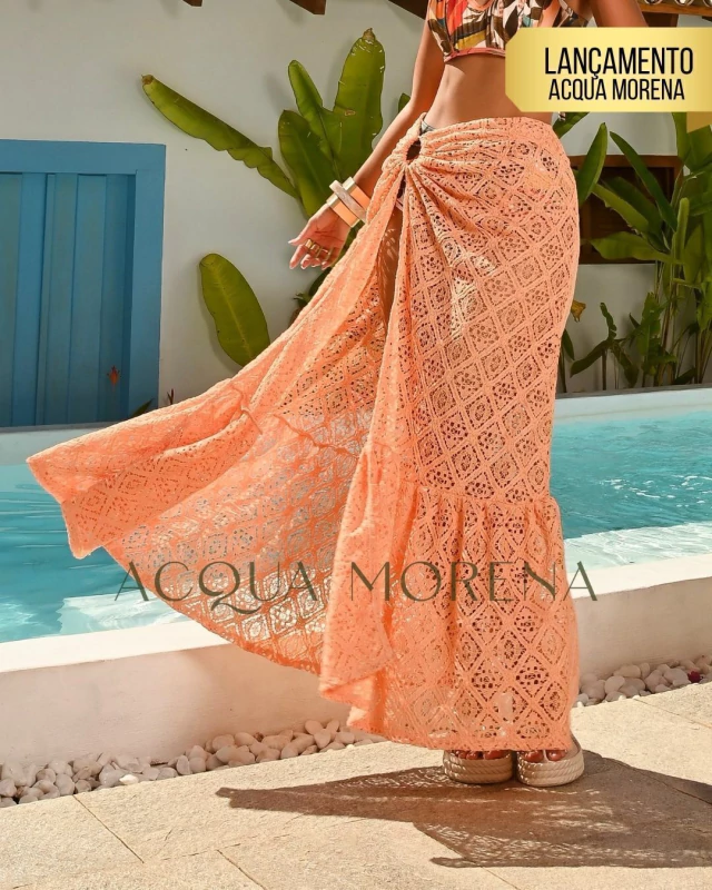 O destaque fica por conta da argola metálica com banho especial para moda praia, que adiciona um toque moderno e refinado à peça. As camadas delicadas da saia trazem movimento e leveza, criando um visual charmoso e feminino.