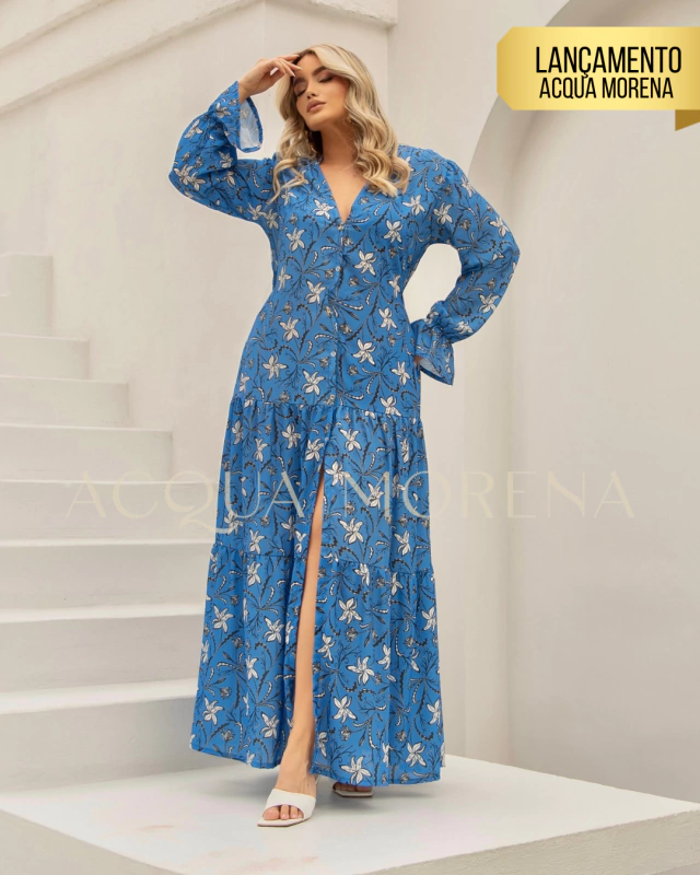 Vestido Longo com Manga Bufante e Saia em Camadas